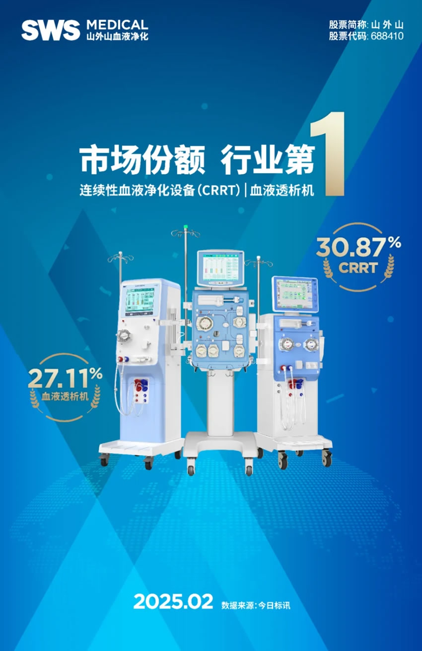 尤為值得一提的是,2025年2月,山外山連續(xù)性血液凈化設(shè)備(CRRT)和血液透析機(jī)分別以30.87%、27.11%的超高市場份額雙雙沖上冠軍寶座,均躍居行業(yè)第一。