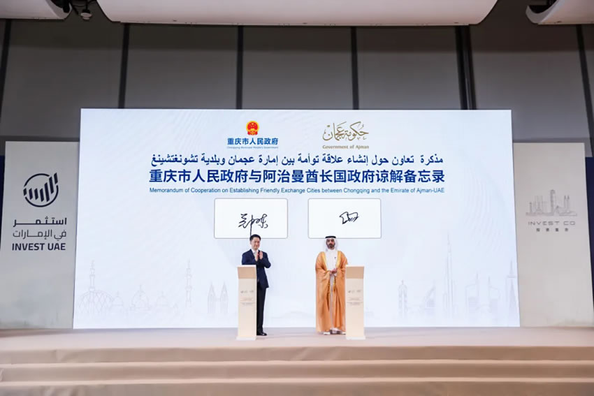 2025年5月23日,以“共享愿景·共享未來(lái)”為主題的“中國(guó)(重慶)—阿聯(lián)酋經(jīng)貿(mào)投資推介會(huì)”在渝舉行。阿治曼酋長(zhǎng)國(guó)政府與重慶市政府在會(huì)上正式簽署友好城市合作諒解備忘錄,阿治曼酋長(zhǎng)國(guó)王儲(chǔ)兼執(zhí)行委員會(huì)主席謝赫阿馬爾·努艾米、阿聯(lián)酋駐華大使侯賽因·哈馬迪、重慶市副市長(zhǎng)鄭向東等數(shù)百位政商高層出席會(huì)議。
