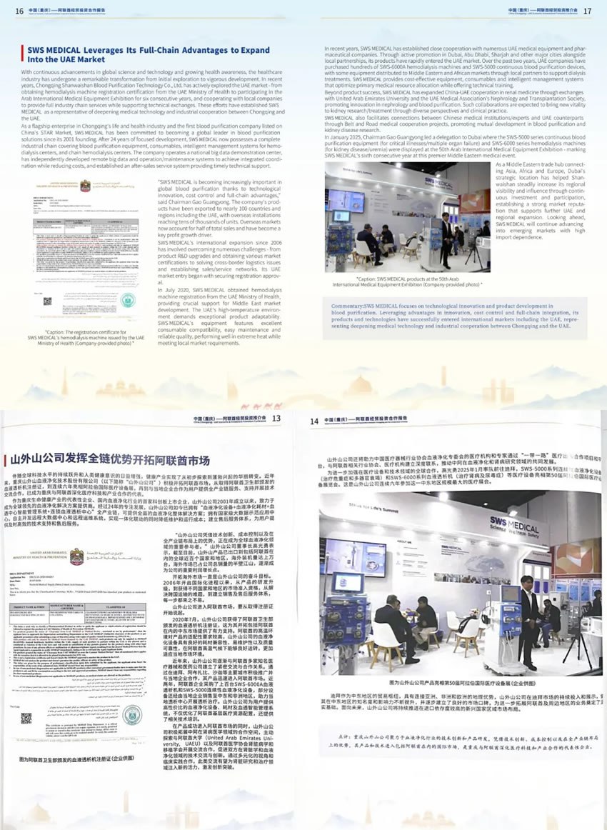 會(huì)上,雙方將在經(jīng)濟(jì)、科技、教育等12個(gè)領(lǐng)域建立常態(tài)化合作機(jī)制,預(yù)計(jì)帶動(dòng)超百億元投資。值得關(guān)注的是,作為重慶生命健康產(chǎn)業(yè)的代表性企業(yè),重慶山外山血液凈化技術(shù)股份有限公司憑借在阿聯(lián)酋市場(chǎng)的深度布局與創(chuàng)新實(shí)踐,成為中國(guó)(重慶)和阿聯(lián)酋經(jīng)貿(mào)合作的八個(gè)核心案例之一。