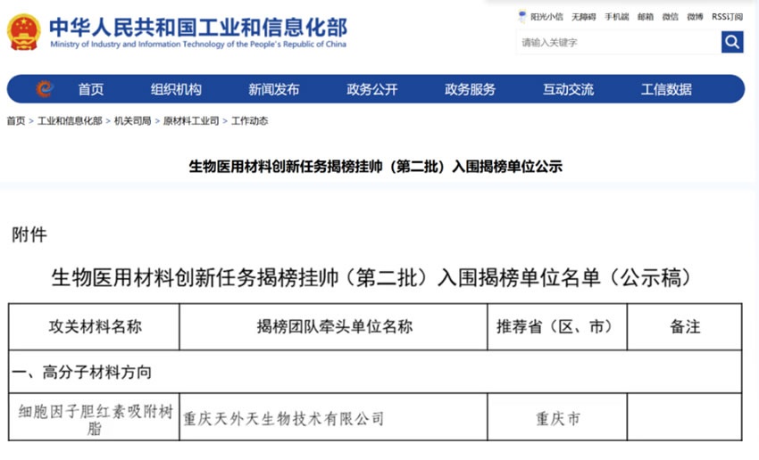 2025年8月26日,工業(yè)和信息化部、國(guó)家藥品監(jiān)督管理局聯(lián)合公示了《生物醫(yī)用材料創(chuàng)新任務(wù)揭榜掛帥(第二批)入圍揭榜單位名單》。重慶山外山血液凈化技術(shù)股份有限公司(“山外山”,科創(chuàng)板股票代碼:688410)全資子公司 —— 重慶天外天生物技術(shù)有限公司(簡(jiǎn)稱“天外天”),憑借“細(xì)胞因子膽紅素吸附樹(shù)脂”成功入圍第二批國(guó)家生物醫(yī)用材料創(chuàng)新任務(wù)“揭榜掛帥” 單位。